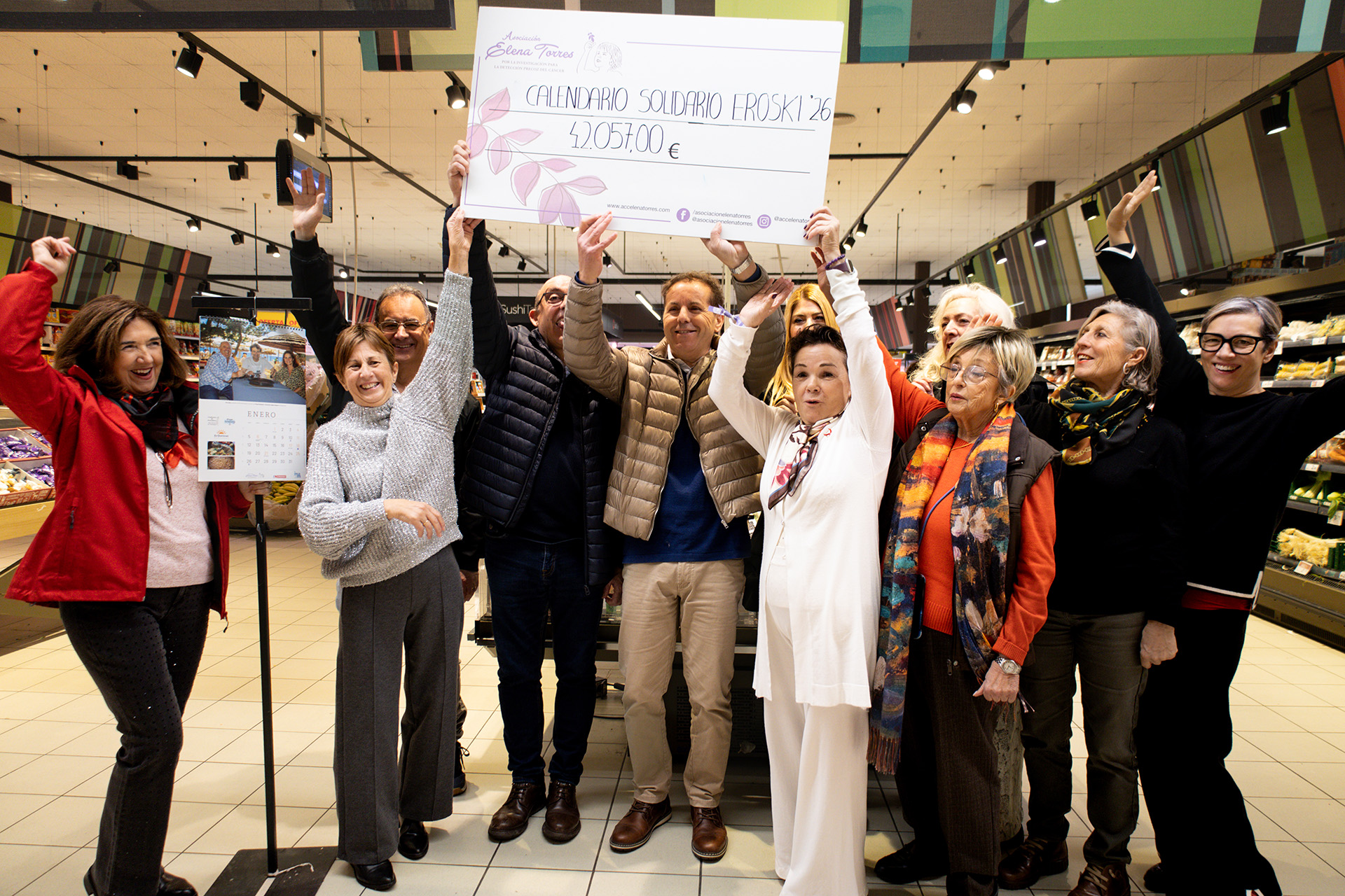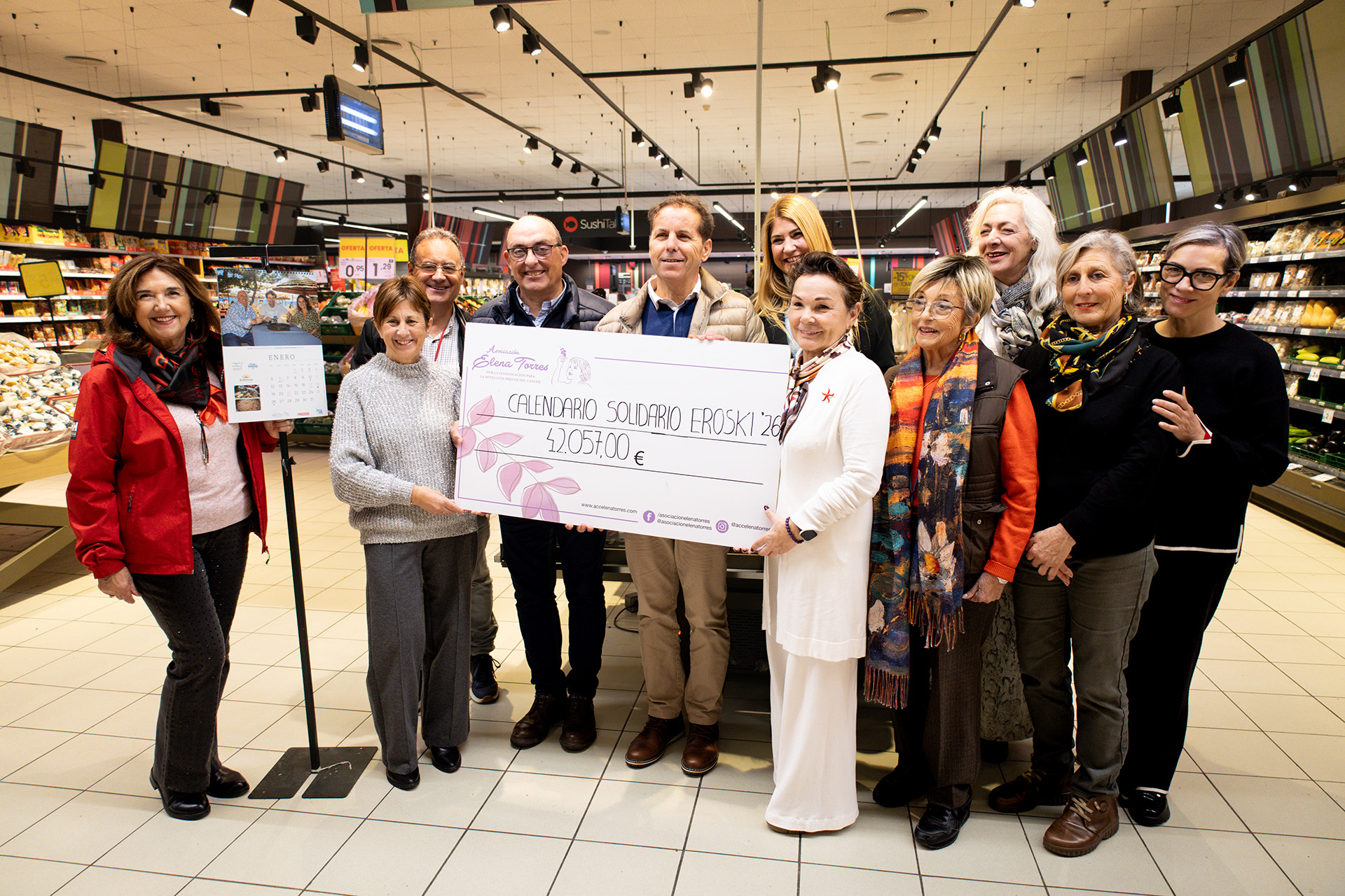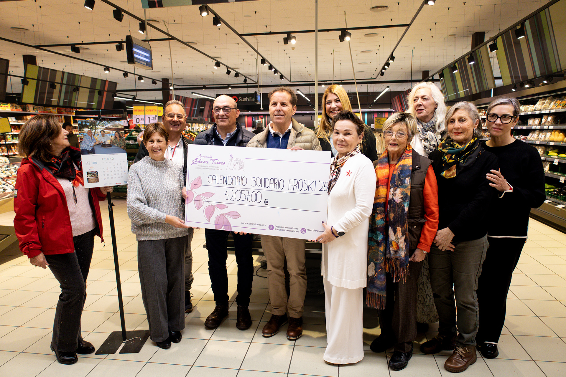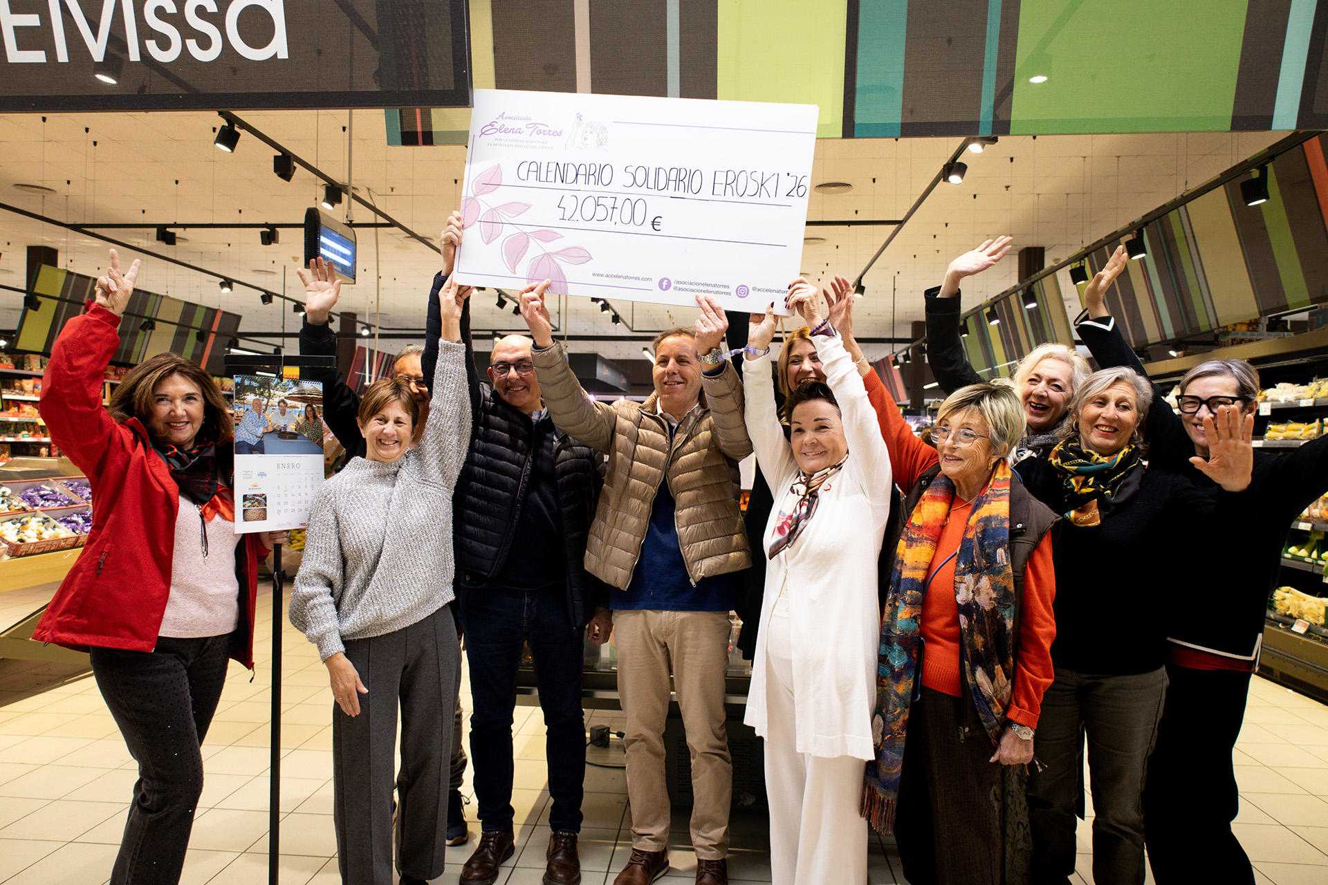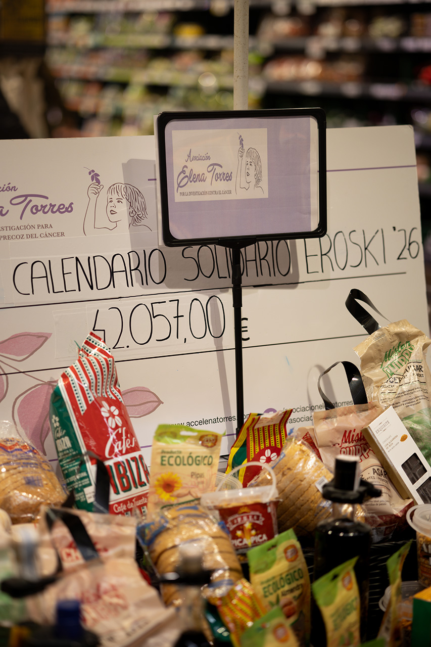 La Asociación Elena Torres por la Investigación para la Detección Precoz del Cáncer ha recibido esta mañana el cheque con la recaudación de la VIII edición de su calendario solidario que ha entregado a su presidenta, Mari Carmen Gutiérrez, el impulsor y responsable de esta idea, el jefe de zona de Grupo Eroski en las Pitiusas, José Izquierdo, y que por primera vez ha superado los 40.000 euros. Este almanaque ha alcanzado una cifra total de 42.057 euros, 5.691 euros más que lo recabado en 2025, que se destinarán íntegramente a financiar el proyecto científico que lidera la investigadora del CSIC, Priscila Monteiro Kosaka, y que desarrolla una tecnología pionera para detectar el cáncer en fases iniciales mediante un simple análisis de sangre.