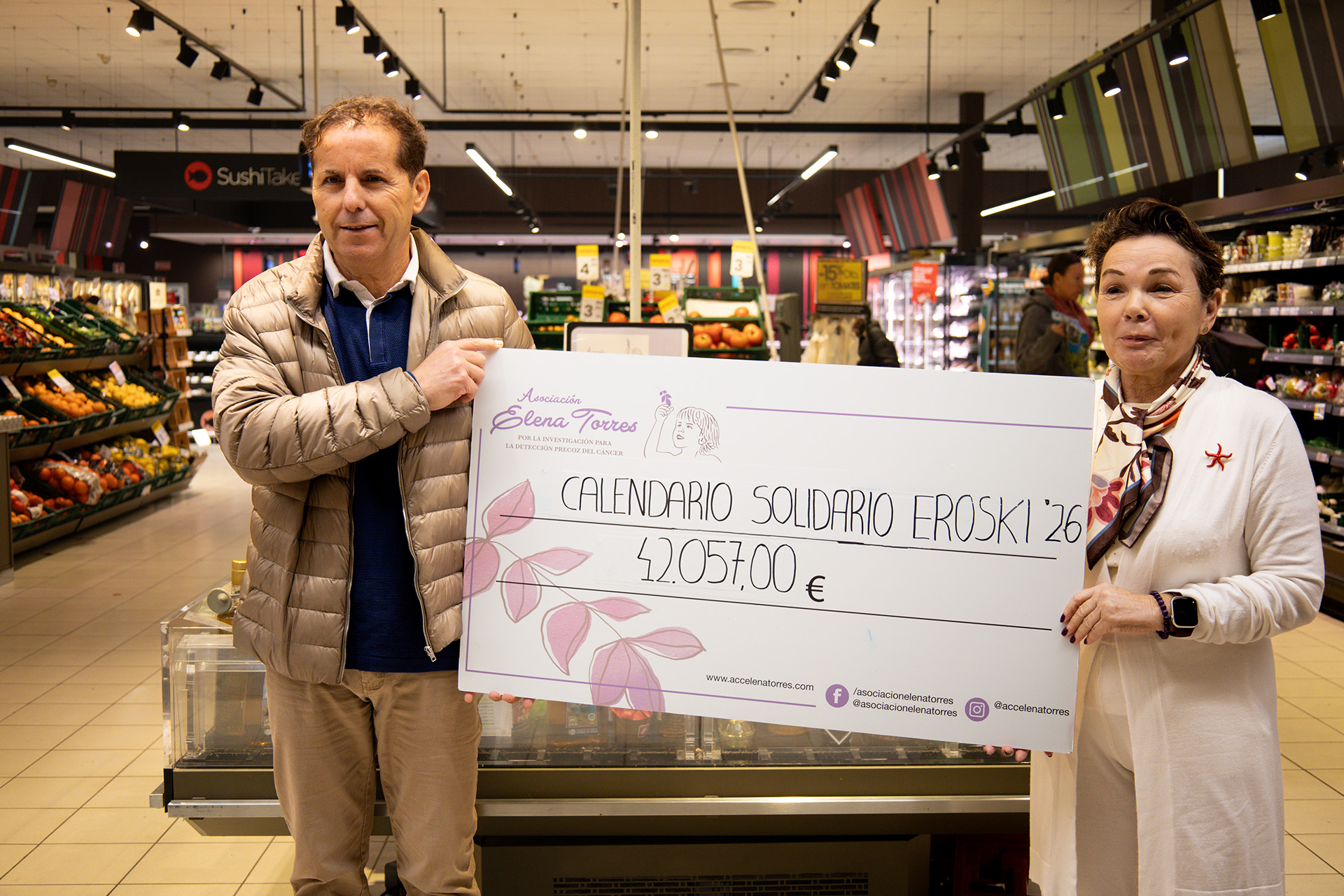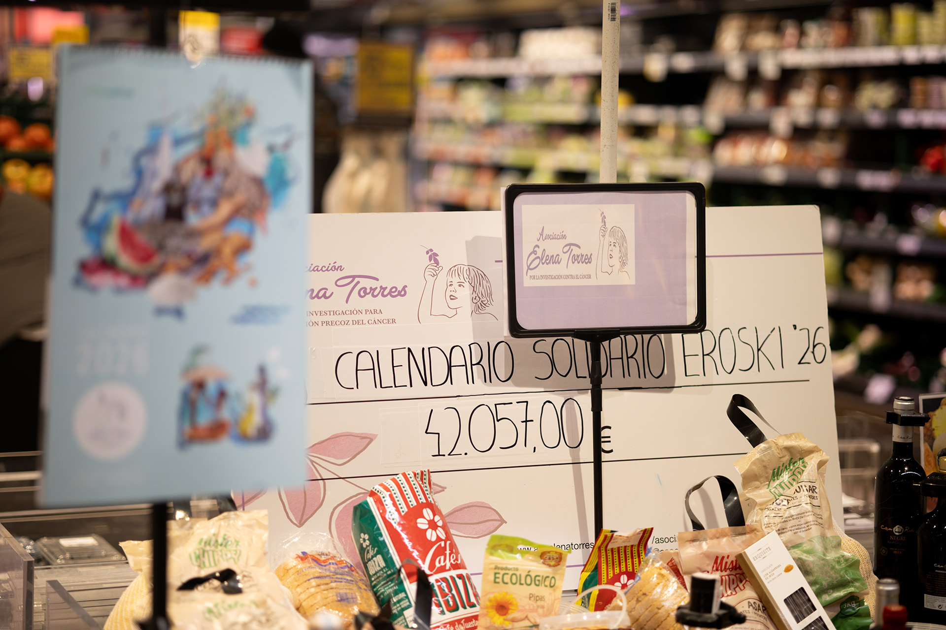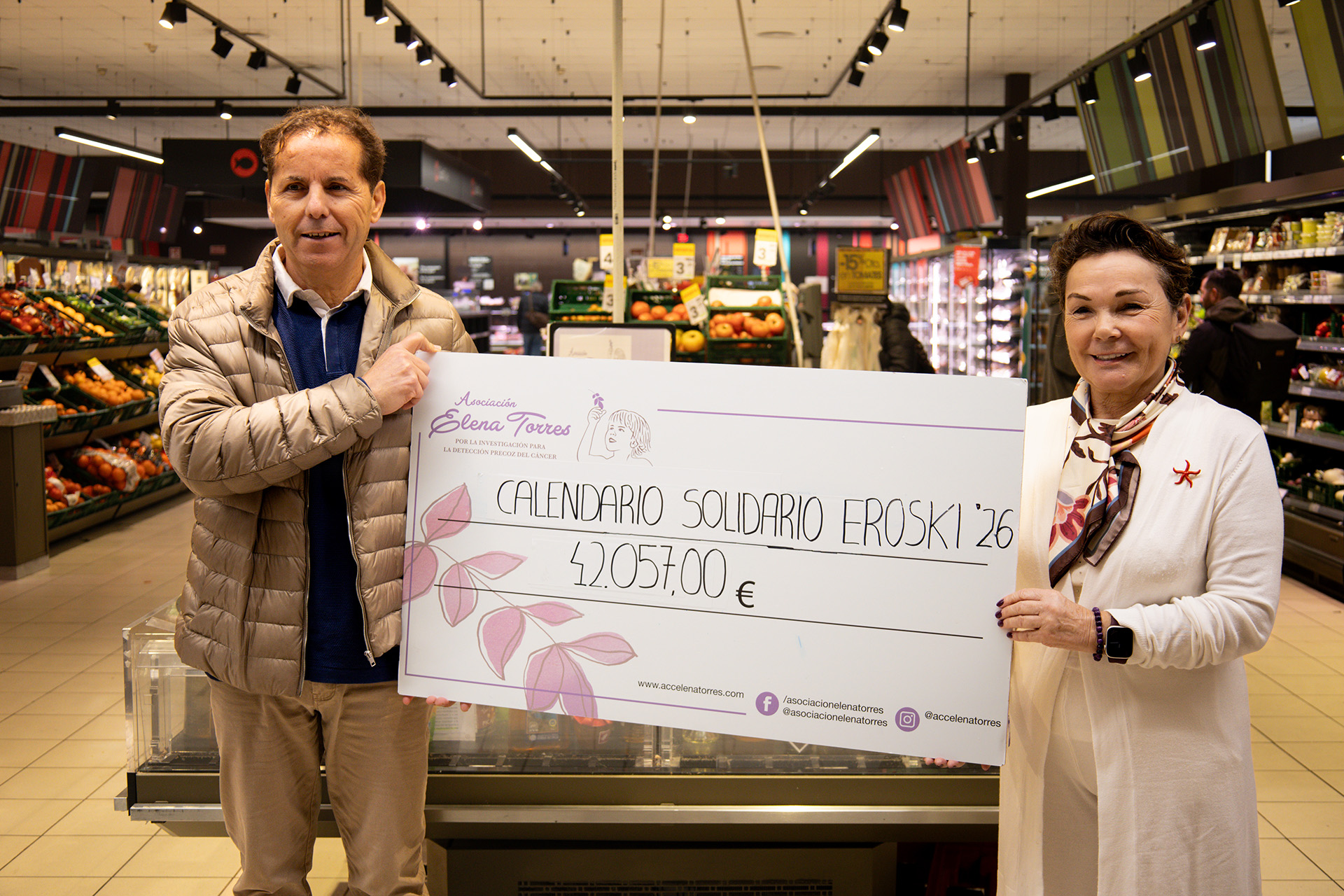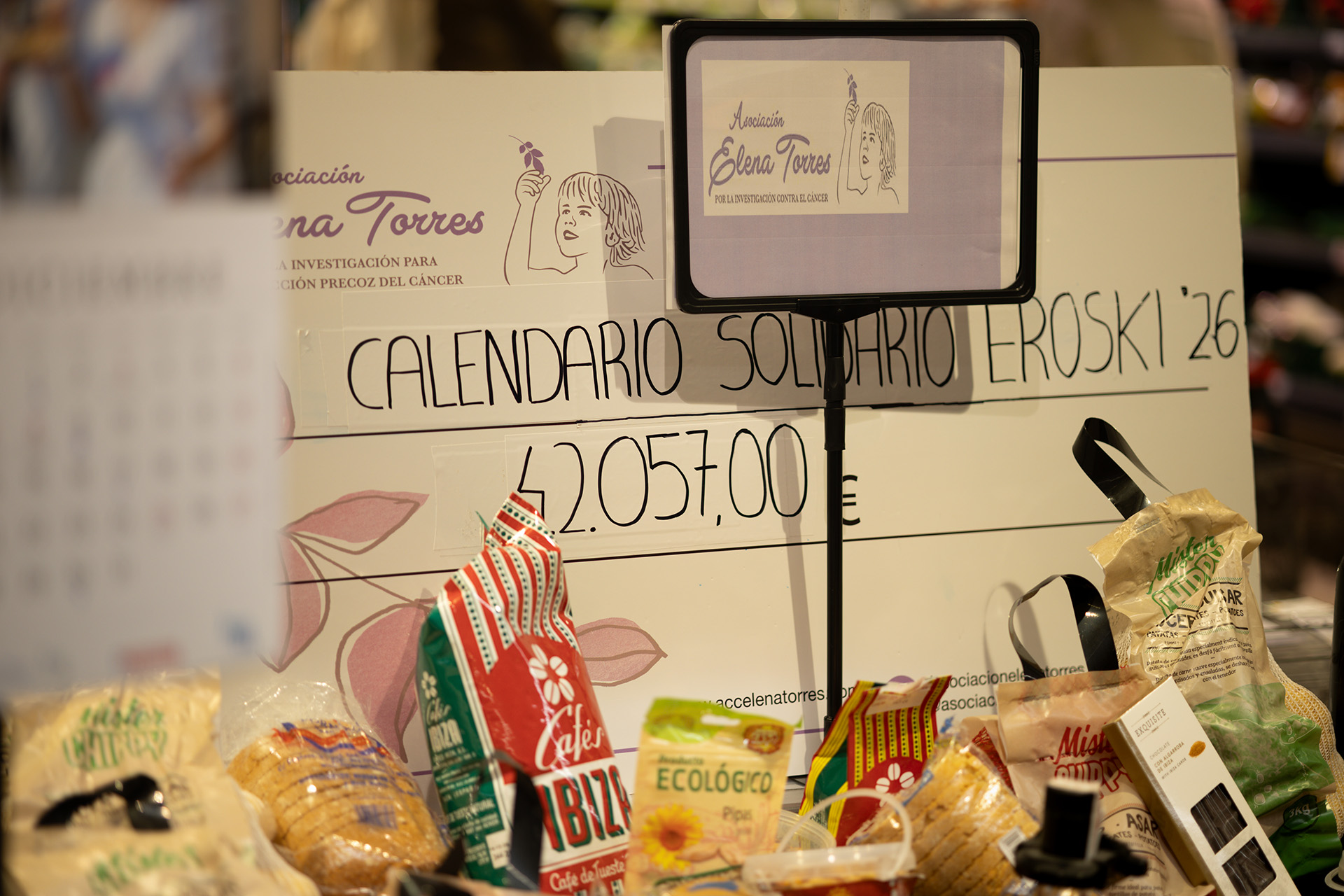 La Asociación Elena Torres por la Investigación para la Detección Precoz del Cáncer ha recibido esta mañana el cheque con la recaudación de la VIII edición de su calendario solidario que ha entregado a su presidenta, Mari Carmen Gutiérrez, el impulsor y responsable de esta idea, el jefe de zona de Grupo Eroski en las Pitiusas, José Izquierdo, y que por primera vez ha superado los 40.000 euros. Este almanaque ha alcanzado una cifra total de 42.057 euros, 5.691 euros más que lo recabado en 2025, que se destinarán íntegramente a financiar el proyecto científico que lidera la investigadora del CSIC, Priscila Monteiro Kosaka, y que desarrolla una tecnología pionera para detectar el cáncer en fases iniciales mediante un simple análisis de sangre.